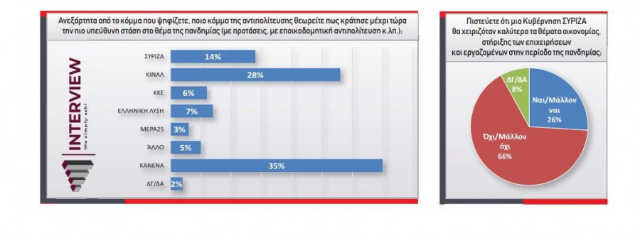 Η κοινή γνώμη αξιολογεί ότι το ΚΙΝ.ΑΛ. κράτησε την καλύτερη και πιο εποικοδομητική στάση στο θέμα της πανδημίας, με το «κανένα» κόμμα να έρχεται πρώτο σε αυτή την ερώτηση. Το ΚΙΝ.ΑΛ. δείχνει ότι στο DNA του παραμένει κόμμα εξουσίας, ακόμα και αν τα ποσοστά του στην πρόθεση ψήφου δείχνουν ότι πρόκειται για ένα μικρό ή, έστω, μικρομεσαίο κόμμα. Στην πρόθεση ψήφου η Ν.Δ. κινείται περίπου στο εκλογικό της ποσοστό του 2019, ενώ ο ΣΥΡΙΖΑ (με όχι και τόσους πολλούς αναποφάσιστους) στριφογυρίζει σταθερά γύρω από το 20%.