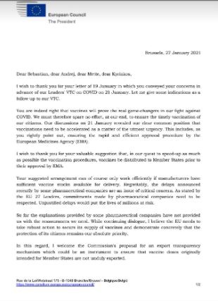 «Μέχρι τώρα, οι εξηγήσεις που δόθηκαν από κάποιες εταιρείες δεν μας έχουν δώσει τις διασφαλίσεις που θέλουμε. Συνεχίζουμε το διάλογο, αλλά πιστεύουμε ότι η ΕΕ οφείλει να αναλάβει δράση για να εξασφαλίσει τα αποθέματα εμβολίων και να διατρανώσει ότι η προστασία των πολιτών της παραμένει απόλυτη προτεραιότητα. Με αυτό ως δεδομένο, καλωσορίζω την πρόταση της Επιτροπής για έναν μηχανισμό διαφάνειας στις εξαγωγές, ο οποίος μπορεί να αποτελέσει εργαλείο για να διασφαλίσει ότι οι δόσεις των εμβολίων που προορίζονται εξαρχής για τα κράτη-μέλη δεν πρόκειται να εξαχθούν (εκτός ΕΕ)», τονίζει ο πρόεδρος του Ευρωπαϊκού Συμβουλίου, δηλώνοντας ότι υποστηρίζει τις προσπάθειες επίλυσης των ζητημάτων με τις εταιρείες μέσα από διάλογο και διαπραγμάτευση.