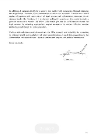 Αναφέρεται έτσι χαρακτηριστικά στο άρθρο 122 της Συνθήκης Λειτουργίας της ΕΕ, με το οποίο η Ένωση και τα κράτη-μέλη της θ' αποκτήσουν δυνατότητα για νομικά μέσα και κατάλληλα επείγοντα μέτρα, ώστε να διασφαλίσουν την αποτελεσματική παραγωγή και παροχή εμβολίων στους πολίτες. Μάλιστα, ο κ. Μισέλ τονίζει ότι η λύση αυτή «θα αποδείξει τη δύναμη και την αξιοπιστία της ΕΕ στην προστασία της υγείας των πολιτών της» και δηλώνει ότι ήδη έχει κατατεθεί από τον ίδιο στην πρόεδρο της Ευρωπαϊκής Επιτροπής, Ούρσουλα φον ντερ Λάιεν , ώστε να διερευνηθεί το πεδίο εφαρμογής της.