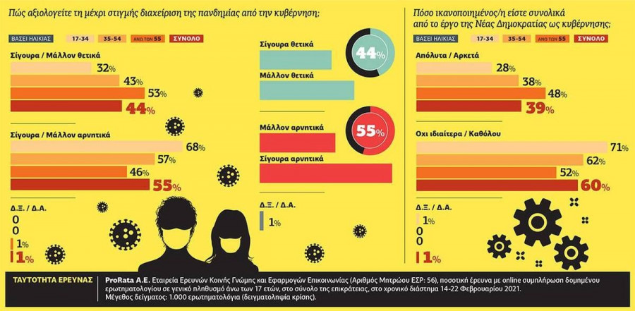 Στο ερώτημα «πώς αξιολογείτε τη μέχρι στιγμής διαχείριση της πανδημίας από την κυβέρνηση;» το 55% των πολιτών απαντά αρνητικά (σίγουρα αρνητικά το 35% και μάλλον αρνητικά το 20%), ενώ μόνο το 44% έχει διαμορφώσει θετική άποψη για τους κυβερνητικούς χειρισμούς.