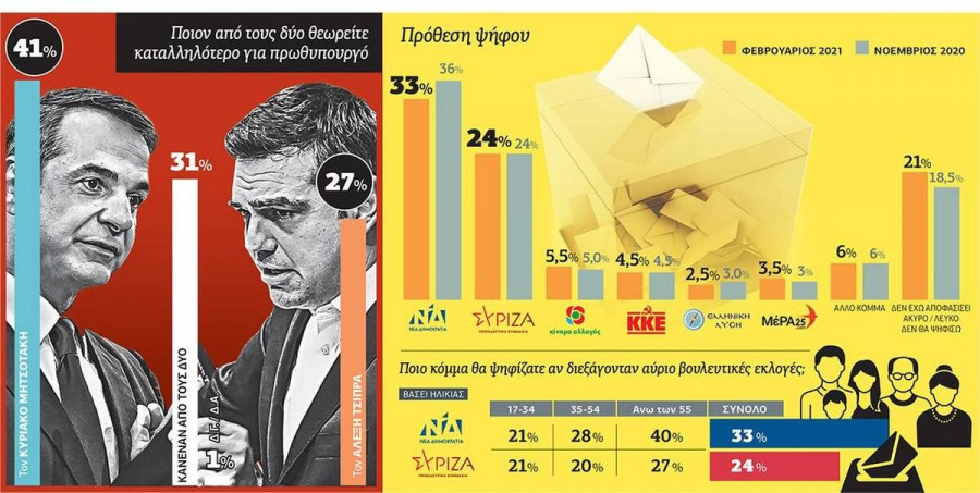 Πιο συγκεκριμένα, η Νέα Δημοκρατία συνεχίζει να προηγείται με ποσοστό 33% έναντι 24% του ΣΥΡΙΖΑ στην πρόθεση ψήφου, με την διαφορά να διαμορφώνεται στις 9 μονάδες.