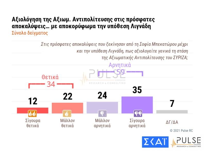 Ακόμη πιο υψηλό είναι το ποσοστό των αρνητικών απαντήσεων για τους χειρισμούς του ΣΥΡΙΖΑ με έξι στους δέκα (59%) να κρίνουν αρνητικά τη στάση της αξιωματικής αντιπολίτευσης. Ειδικότερα, «σίγουρα αρνητικά» κρίνει τη στάση του ΣΥΡΙΖΑ το 35%, «μάλλον αρνητικά» το 24%, «μάλλον θετικά» το 22% και «σίγουρα θετικά» το 12%.