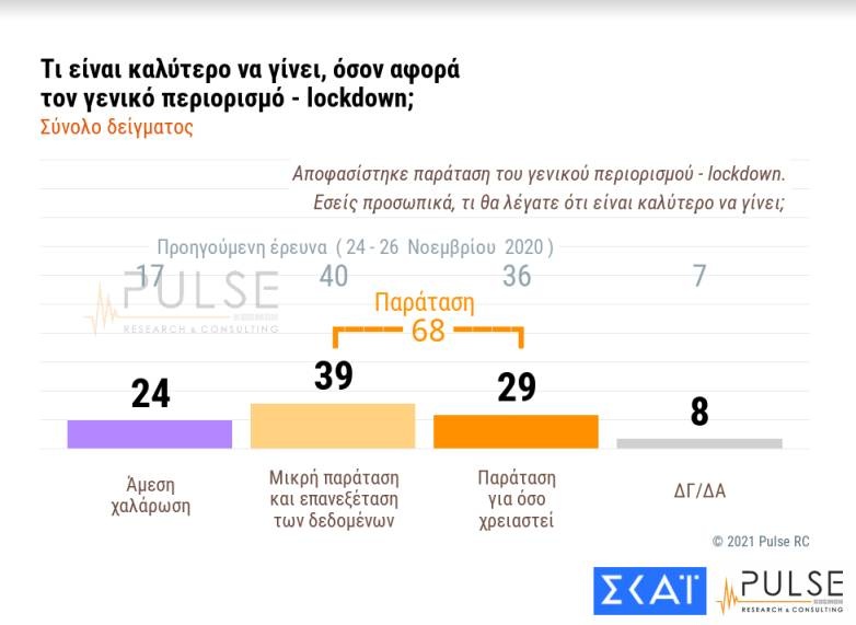 Σχεδόν επτά στους δέκα τάσσονται υπέρ της παράτασης του lockdown είτε μικρή με επανεξέταση των δεδομένων (39%) είτε για όσο χρειαστεί (29%), ενώ υπέρ της άμεσης χαλάρωση των περιορισμών τοποθετείται το 24%.