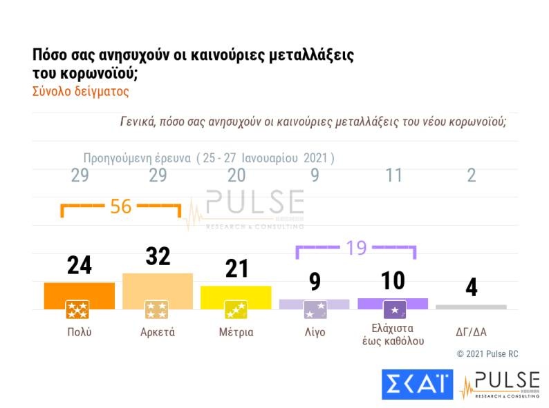 Πάνω από τους μισούς ερωτηθέντες (56%) ανησυχούν για τις μεταλλάξεις του κορoνοϊού «πολύ» (24%) ή «αρκετά» (32%). Μέτρια ανησυχία εξέφρασε το 21% ενώ το 19% ανησυχεί λίγο (9%) ή ελάχιστα έως καθόλου (10%). Η ανησυχία για τις μεταλλάξεις του κορoνοϊού ανεβαίνει στο 66% στην ηλικιακή ομάδα των 66 και άνω.