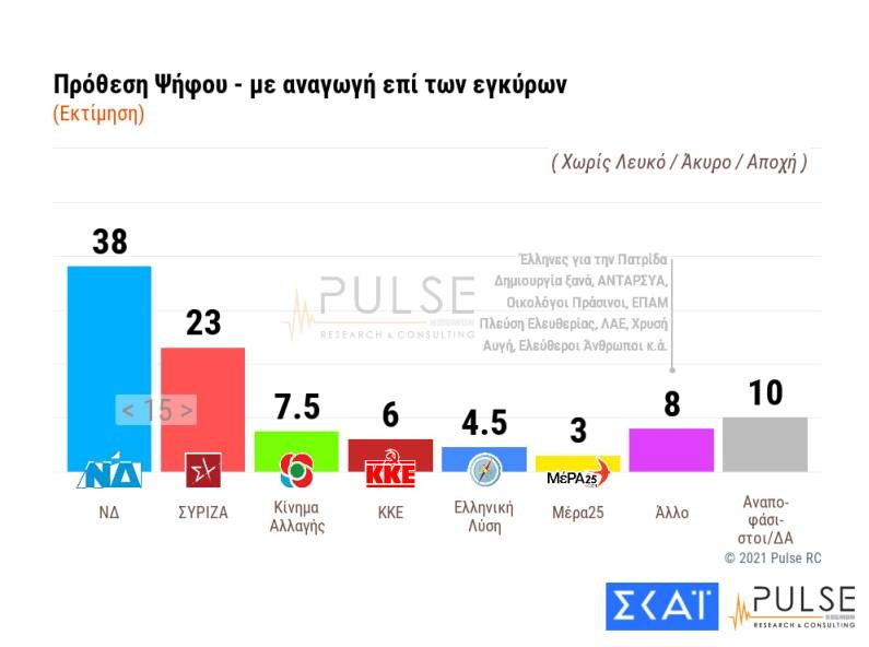 Προβάδισμα 15 μονάδων διατηρεί η ΝΔ με 38% έναντι 23% του ΣΥΡΙΖΑ, στην πρόθεση ψήφου με αναγωγή επί των εγκύρων, σύμφωνα με τη δημοσκόπηση του ΣΚΑΪ και της Pulse. Ακολουθούν το Κίνημα Αλλαγής με 7,5%, το ΚΚΕ με 6%, η Ελληνική Λύση με 4,5%, το ΜέΡΑ25 με 3%. «Άλλο» απάντησε το 8% ενώ οι Αναποφάσιστοι/ΔΑ είναι στο 10%.