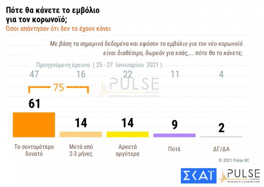 Η έρευνα της Pulse είναι πανελλαδική και έγινε τηλεφωνικά με τη χρήση δομημένου ηλεκτρονικού ερωτηματολογίου σε δείγμα 1.306 ατόμων το διάστημα 26 - 28 Φεβρουαρίου 2021.