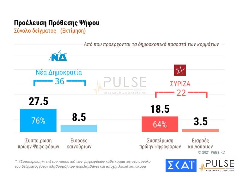 Η συσπείρωση των ψηφοφόρων της ΝΔ εκτιμάται στο 76% και του ΣΥΡΙΖΑ στο 64%.