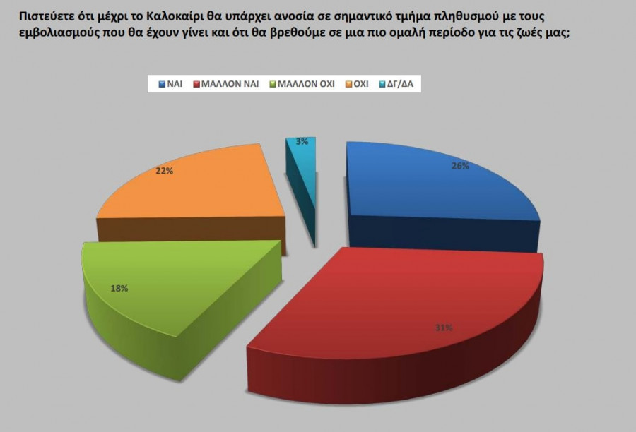 Για την πορεία του εμβολιασμού και την αντιμετώπιση της πανδημίας το 57% θεωρεί ότι μέχρι το καλοκαίρι θα υπάρχει πια ανοσία σε ένα σημαντικό τμήμα του πληθυσμού ενώ ένα 56% δηλώνει ικανοποιημένο και από τους ρυθμούς εμβολιασμού, τον προγραμματισμό και τον συνολικό τρόπο οργάνωσής του.