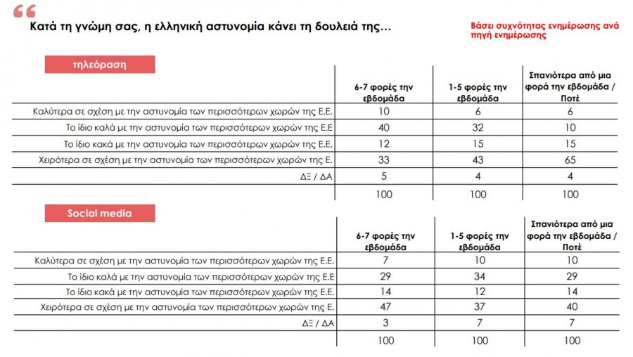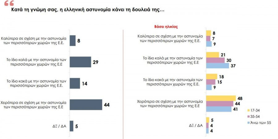 Το 8% διατηρεί την άποψη ότι η Ελληνική Αστυνομία κάνει τη δουλειά της χειρότερα σε σχέση με την αστυνομία των περισσότερων χωρών της Ε.Ε και το 29% το ίδιο καλά. Αντίθετα, το 44% πιστεύει ότι η ελληνική αστυνομία κάνει τη δουλειά της χειρότερα συγκριτικά με την αστυνομία των περισσότερων χωρών της Ε.Ε και το 14% το ίδιο κακά.