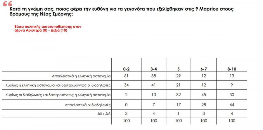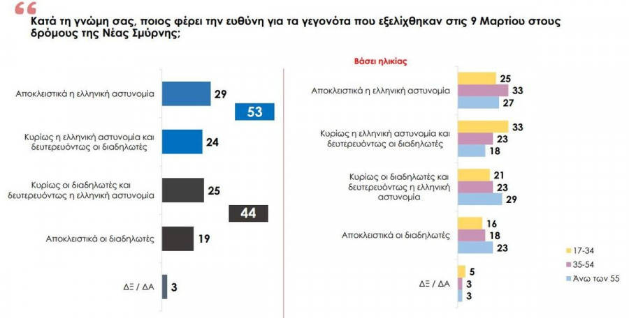 Σε σχέση με τα γεγονότα της 9ης Μαρτίου στους δρόμους της Νέας Σμύρνης, το 53% δηλώνει ότι την αποκλειστική ή κύρια ευθύνη φέρει η Ελληνική Αστυνομία, το 44% ότι την αποκλειστική ή κύρια ευθύνη φέρουν οι διαδηλωτές, ενώ το 3% επιλέγει να μην τοποθετηθεί.
