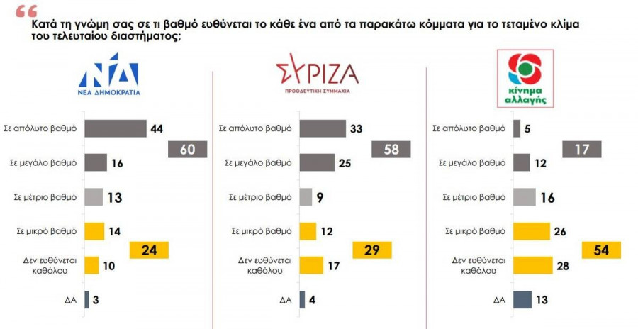 Για το τεταμένο κλίμα του τελευταίου διαστήματος, το μεγαλύτερο μερίδιο ευθύνης επιρρίπτεται στο κυβερνών κόμμα, καθώς το 60% δηλώνει πως το τελευταίο φέρει σχετική ευθύνη σε «μεγάλο» ή «απόλυτο» βαθμό. Αντίστοιχα, το 58% δηλώνει ότι «μεγάλη» ή «απόλυτη» ευθύνη φέρει το κόμμα της αξιωματικής αντιπολίτευσης, ενώ ακολουθεί το Κομμουνιστικό Κόμμα Ελλάδος, στο οποίο επιρρίπτονται «μεγάλες» ή «απόλυτες» ευθύνες από το 40% των ερωτηθέντων. Τέλος, το κόμμα στο οποίο επιρρίπτεται το μικρότερο μερίδιο ευθύνης είναι το Κίνημα Αλλαγής.