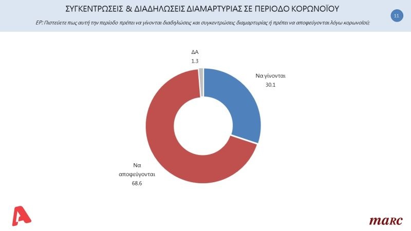 Το 68,6% των πολιτών πιστεύει πως οι συγκεντρώσεις και οι διαδηλώσεις διαμαρτυράις σε περίοδο κορονοϊού θα πρέπει να αποφεύγονται, ενώ ένα 30,1% πιστεύει πως πρέπει να γίνονται.