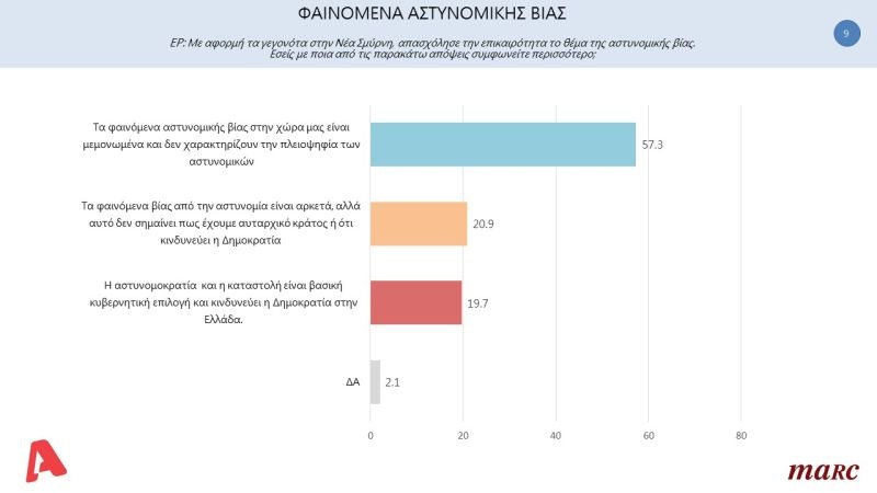 Σε ερώτηση για τα φαινόμενα αστυνομικής βίας στη χώρα, το 57,3% θεωρεί ότι πρόκειται για μεμονωμένα περιστατικά, το 20,9% θεωρεί πως είναι αυξημένα αλλά δεν σημαίνουν ότι κινδυνεύει η Δημοκρατία στη χώρα ενώ το 19,7% πιστεύει πως υπάρχει κίνδυνος για το πολίτευμα.