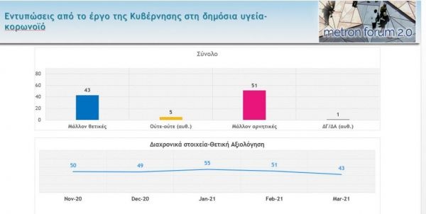 Οι εντυπώσεις για το έργο της κυβέρνησης στην υπόθεση του κορονοϊου δεν είναι και τόσο καλές. Όταν τον Νοέμβριο οι θετικές γνώμες ήταν στο 50% και τον Μάρτιο έπεσε στο 40% τότε θα πρέπει να χτυπήσει καμπανάκι για την κυβέρνηση καθώς ο κόσμος ενδεχομένως έχει κουραστεί από τα απανωτά lockdown και τις οικονομικές συνέπειες της υγειονομικής κρίσης. Σοβαρό είναι το πρόβλημα για την κυβέρνηση στις ηλικίες 17-34 αφού το 66% κρίνει αρνητικά το έργο της στη δημόσια υγεία. Αντίθετα, θετικά κρίνεται το έργο στις ηλικίες από 65 και άνω με ποσοστό 61%.
