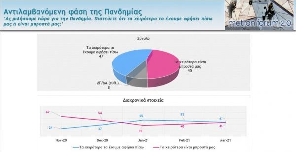 Οι πολίτες ερωτώνται αν τα χειρότερα είναι μπροστά μας ή όχι και το 45% περιμένει ότι έρχονται ακόμη πιο δύσκολες ημέρες ενώ το 47% ότι έχουμε αφήσει πίσω μας τα χειρότερα. Υπάρχει μια άνοδος 5 μονάδων σε ένα μήνα για όσους εμφανίζονται απαισιόδοξοι. Το 63% των πολιτών πιστεύει ότι μέσα στο 2021 θα επανέλθει η φυσιολογική καθημερινότητα ενώ 1 στους 4 ότι αυτό θα συμβεί στο τέλος του χρόνου. Καλά είναι τα νέα για τον εμβολιασμό, αν και οι αρνητές παραμένουν ακόμη πολλοί.
