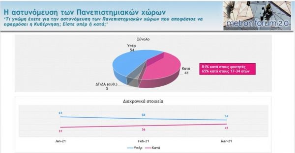 Ένα ποσοστό 54%, αλλά με υποχώρηση 10 μονάδων από τον Ιανουάριο, δηλώνει υπέρ της πανεπιστημιακής αστυνομίας ενώ κατά είναι το 41% από 31%. Μάλιστα κατά είναι το 81% στους φοιτητές και το 65% στις ηλικίες 17-34, απορρίπτεται δηλαδή από τους νέους. Με αφορμή τα επεισόδια στη Νέα Σμύρνη, το 77% συμφωνεί ότι κάποιοι αστυνομικοί ασκούν υπερβολική βία, και μόλις 20% διαφωνούν.