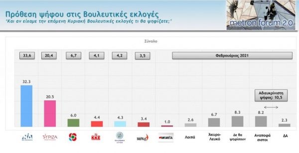 Πιο συγκεκριμένα, στην πρόθεση ψήφου η Νέα Δημοκρατία λαμβάνει ποσοστό 32,3%, χάνοντας σε ένα μήνα 1,3 ποσοστιαίες μονάδες (33,6% τον Φεβρουάριο). Ο ΣΥΡΙΖΑ από την άλλη, λαμβάνει ποσοστό 20,5%, σχεδόν ίδιο με το 20,4% του περασμένου μήνα. Τρίτο κόμμα αναδεικνύεται το Κίνημα Αλλαγής με 6% και ψυχρολουσία για τη Φώφη Γεννηματά που επίσης δεν μπορεί να κεφαλαιοποιήσει την όποια δυσαρέσκεια από την κυβέρνηση και χάνει 0,7 μονάδες από τον Φεβρουάριο. Ακολουθεί το ΚΚΕ με 4,4%, η Ελληνική Λύση με 4,3%, το Μέρα25 με 3,4%. Η αδιευκρίνιστη ψήφος φτάνει το 10,5%.