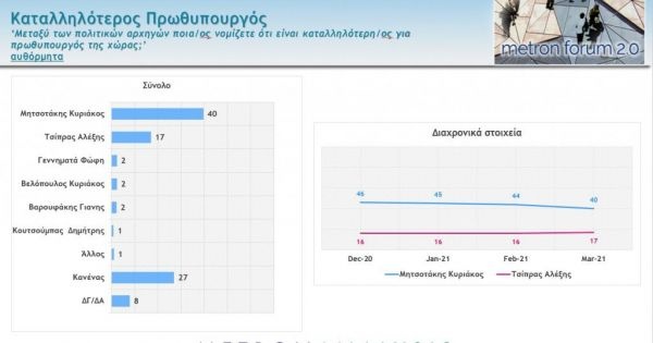 Μεταξύ των πολιτικών αρχηγών, 4 στους 10 πιστεύουν ότι καταλληλότερος πρωθυπουργός είναι ο Κυριάκος Μητσοτάκης. Το 17% βλέπει τον Αλέξη Τσίπρα, 2% τους Φώφη Γεννηματά, Κυριάκο Βελόπουλο, Γιάνη Βαρουφάκη. Πάνω από 1 στους 4 πολίτες απαντά κανένας από τους πολιτικούς αρχηγούς.