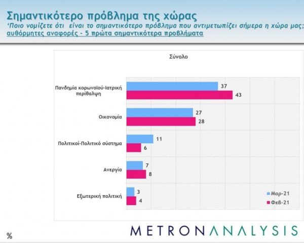 Ως πιο σημαντικό πρόβλημα για τη χώρα παραμένει η πανδημία και η ιατρική περίθαλψη με 37%, όμως πριν από ένα μήνα ήταν στο 45%. Στη δεύτερη θέση βρίσκεται η οικονομία με 27% ενώ ακολουθεί το πολιτικό σύστημα με 11%, από 6% τον Φεβρουάριο, κάτι που δείχνει αύξηση των πολιτών που δεν εμπιστεύονται τους πολιτικούς. Ακολουθούν η ανεργία με 7% και η εξωτερική πολιτική με 3%.