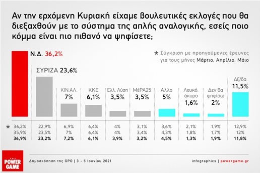 Συγκεκριμένα σύμφωνα με την νέα δημοσκόπηση που διενεργήθηκε για λογαριασμό του ιστότοπου powergame.gr, στην πρόθεση ψήφου τη ΝΔ προηγείται με 36,2% έχοντας προβάδισμα 12,6 ποσοστιαίων μονάδων έναντι του ΣΥΡΙΖΑ που συγκεντρώνει το 23,6% των προτιμήσεων.