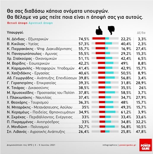 Ο υπουργός Ανάπτυξης και Επενδύσεων Άδωνις Γεωργιάδης συγκεντρώνει 39,8 % θετική κριτική για το έργο του, ενώ στην επόμενη θέση βρίσκεται ο Γιώργος Γεραπετρίτης και έπεται ο υπουργός Δικαιοσύνης Κώστας Τσιάρας.