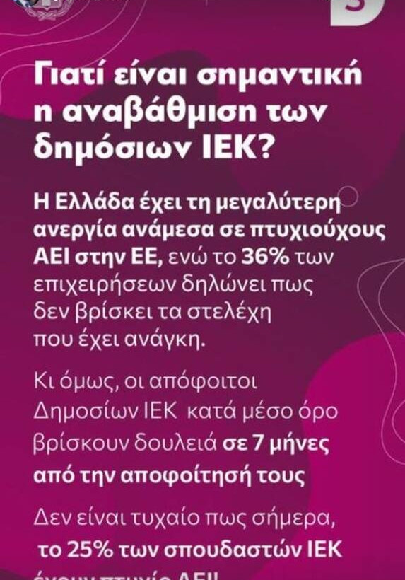 «Η Ελλάδα έχει τη μεγαλύτερη ανεργία ανάμεσα σε πτυχιούχους ΑΕΙ στην ΕΕ, ενώ το 36% των επιχειρήσεων δηλώνει πως δεν βρίσκει τα στελέχη που έχει ανάγκη. Κι όμως οι απόφοιτοι των δημοσίων ΙΕΚ κατά μέσο όρο βρίσκουν δουλειά σε 7 μήνες από την αποφοίτησή τους. Δεν είναι τυχαίο πως σήμερα το 25% των σπουδαστών ΙΕΚ έχουν πτυχίο ΑΕΙ», αναφέρει για την αναβάθμιση των Δημόσιων ΙΕΚ.