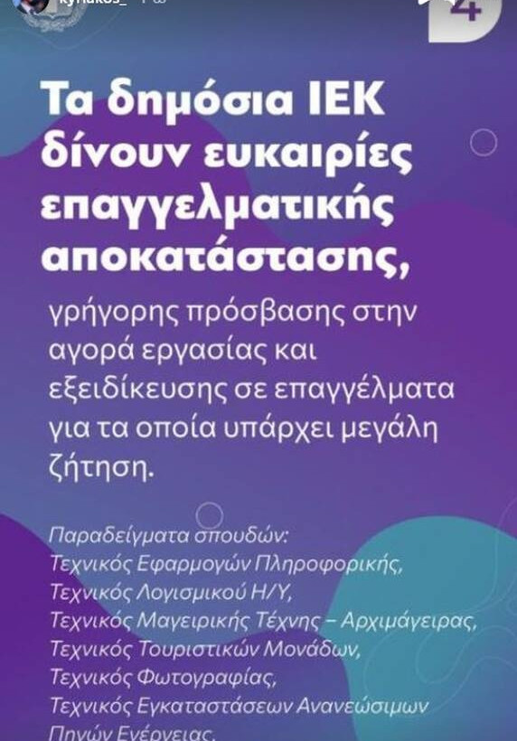 Στις αναρτήσεις του Κυριάκου Μητσοτάκη εμφανίζονται κάποιες από τις ειδικότητες που υπάρχουν στα Δημόσια ΙΕΚ και οι οποίες προσφέρουν ευκαιρίες επαγγελματικής αποκατάστασης στην αγορά