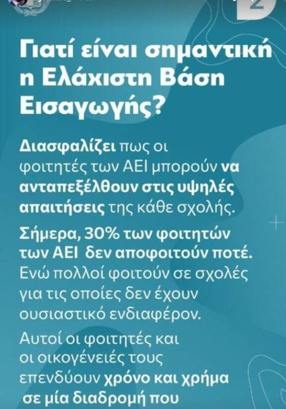 Η Ελάχιστη Βάση Εισαγωγής μαζί με την αναβάθμιση των Δημοσίων ΙΕΚ θα οδηγήσει στην επαγγελματική αποκατάσταση για τους νέους, αναφέρει ο Κυριάκος Μητσοτάκης λέγοντας πως, «διασφαλίζει πως οι φοιτητές των ΑΕΙ μπορούν να αντεπεξέλθουν στις υψηλές απαιτήσεις της κάθε σχολής. Σήμερα 30% των φοιτητών δεν αποφοιτούν ποτέ. Ενώ πολλοί φοιτούν σε σχολές για τις οποίες δεν έχουν ουσιαστικό ενδιαφέρον. Αυτοί οι φοιτητές και οι οικογένειές τους επενδύουν σε χρόνο και χρήμα σε μία διαδρομή που αποδεικνύεται τελικά αδιέξοδη».