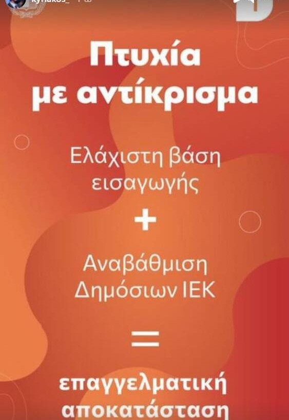 Αναφορά στα «επαγγέλματα του μέλλοντος» στην σημασία της Ελάχιστης Βάσης Εισαγωγής αλλά και στις σπουδές των νέων στα ΙΕΚ, κάνει ο Κυριάκος Μητσοτάκης, μέσω αναρτήσεων στο προσωπικό του λογαριασμό στο instagram.