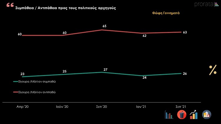 Ωστόσο είναι η πρώτη φορά από τον Απρίλιο του 2020 που η αντιπάθεια είναι μεγαλύτερη από την συμπάθεια προς το πρόσωπο του πρωθυπουργού. Ακολουθεί ο Αλέξης Τσίπρας με ποσοστό 34%, ο Δημήτρης Κουτσούμπας με ποσοστό 32%, η Φώφη Γεννηματά με ποσοστό 26%, ο Γιάννης Βαρουφάκης με ποσοστό 23% ενώ τελευταίος σε συμπάθεια μεταξύ των πολιτικών αρχηγών καταγράφεται ο Κυριάκος Βελόπουλος, με το αντίστοιχο ποσοστό να είναι 11%.
