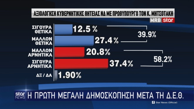 Σχετικά με τα μέτρα που ανακοίνωσε στη ΔΕΘ ο Κυριάκος Μητσοτάκης, τα νέα για την κυβέρνηση δεν είναι καλά καθώς το 58,4% τα αξιολογεί ως σίγουρα αρνητικά ή μάλλον αρνητικά και το 30,4% κάνει λόγο για σίγουρα θετικά ή μάλλον θετικά, με το 11,2% να μην ξέρει ή να μην απαντά.Για την αντιμετώπιση της ακρίβειας με την αύξηση τιμών σε βασικά αγαθά, σχεδόν τα 2/3 των ερωτηθέντων (64%) κρίνει αρνητικά τις κυβερνητικές ανακοινώσεις και μόλις το 22,7% τις αξιολογεί θετικά, με το 13,3% να μην ξέρει ή να μην απαντά. δεξεΣτο εάν υπάρχει κάποιο οικονομικό μέτρο που σας αφορά, από το οποίο έχετε κέρδος, το 24,3% λέει ναι και το 50,9% όχι, ενώ 24,8% δεν γνωρίζει τι σχετίζεται μαζί του από τις εξαγγελίες, ποσοστό κυρίως αυτοαπασχολούμενων και φοιτητών.
