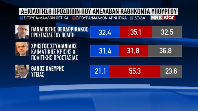 Σχετικά με τον πρόσφατο ανασχηματισμός, μόνο το 25,1% κρίνει πως ήταν προς σωστή κατεύθυνση, με το 50% να εκτιμά πως ήταν λάθος, ενώ το 25% δήλωσε πως ΔΕ/ΔΑ.Μάλιστα, από τους ψηφοφόρους της ΝΔ, ο ένας στους τρεις εκτιμά πως ήταν λάθος και οι γνώμες αυτές προέρχονται από το κέντρο της παράταξης.Όσον αφορά τα πρόσωπα του ανασχηματισμού, το 55,3% δεν βλέπει με καλό μάτι τον κ. Πλεύρη, τα αισθήματα για τους κ.κ. Θεοδωρικάκο και Στυλιανίδη είναι «χλιαρά».Θεοδωρικάκος: 32,4 ναι, 35,1 αρνητικά 32,5 ΔΓ/ΔΑΣτυλιανίδης 31,4 31,8 και 36,8 ΔΓ/ΔΑΠλεύρης 21,1, 55,3 και 23,6 ΔΓ/ΔΑ.