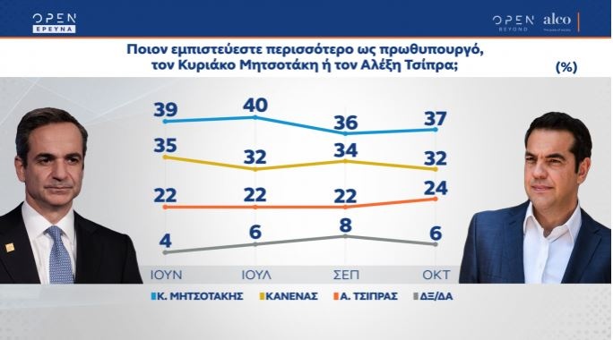 Καταλληλότερος για πρωθυπουργός θεωρείται ο Κυριάκος Μητσοτάκης με 37% έναντι του Αλέξη Τσίπρα ο οποίος σημειώνει 24%.