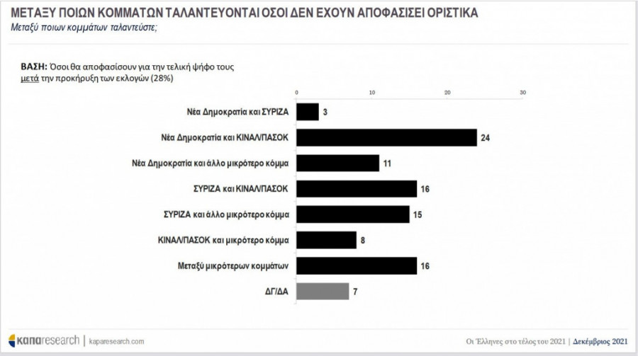 Ένα από τα ενδιαφέροντα στοιχεία, αφορά τους αναποφάσιστους, που αναμένεται να αποφασίσουν για την ψήφο τους μετά την προκήρυξη των εκλογών και φαίνεται να είναι σε ένα ποσοστό της τάξης του 28%. Από αυτούς τους ψηφοφόρους το 24% ταλαντεύεται ανάμεσα σε Νέα Δημοκρατία και Κίνημα Αλλαγής, το 16% ανάμεσα σε ΣΥΡΙΖΑ και Κίνημα Αλλαγής και μόλις το 3% ανάμεσα σε Νέα Δημοκρατία και ΣΥΡΙΖΑ.