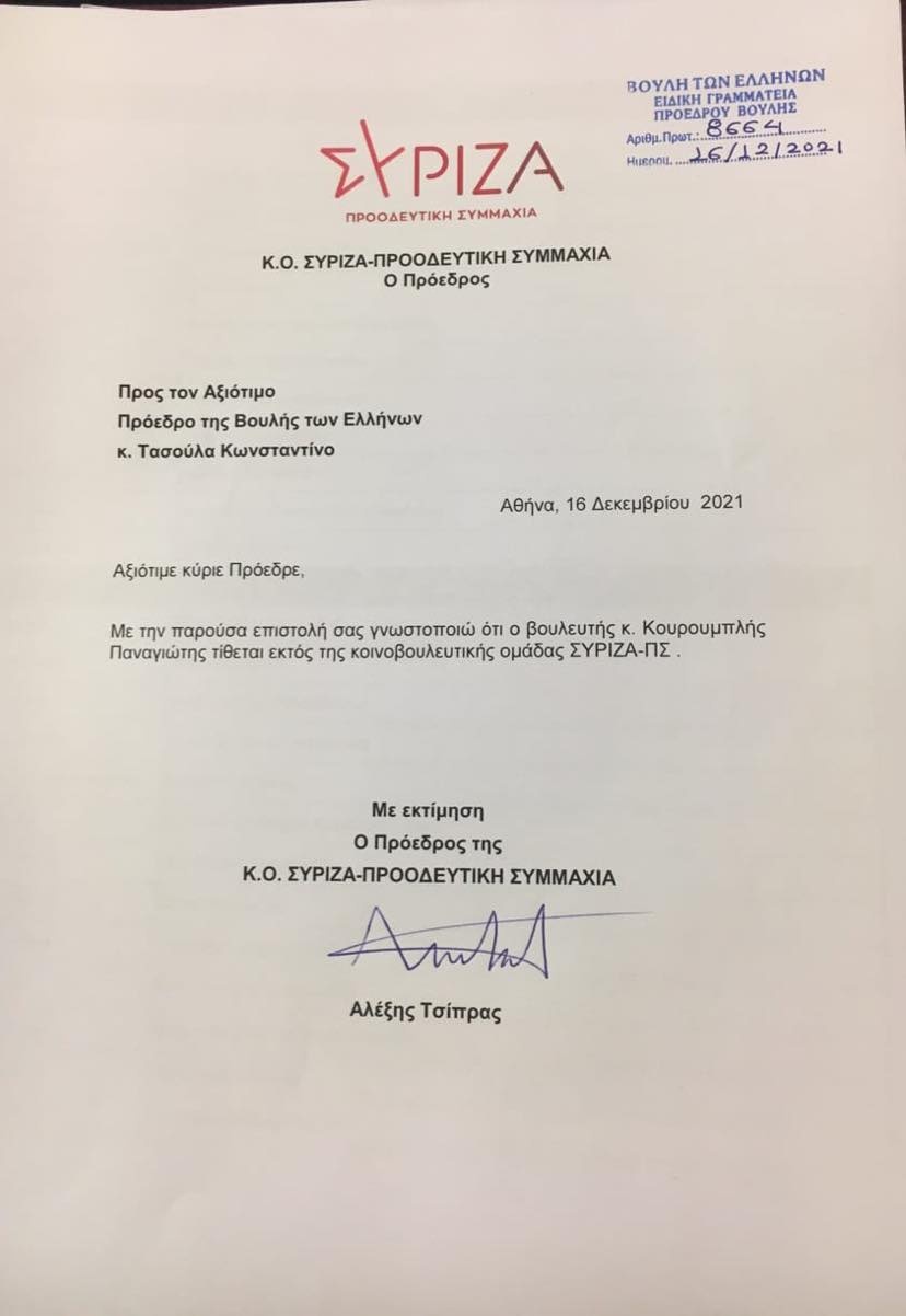 Ο Αλέξης Τσίπρας, νωρίτερα, τηλεφώνησε στη γραμματέα της κοινοβουλευτικής ομάδας του ΣΥΡΙΖΑ, Όλγα Γεροβασίλη, προκειμένου η τελευταία να μεταφέρει το τελεσίγραφο του κ. Τσίπρα στον κ. Κουρουμπλή, πως αν δεν ανασκευάσει τις δηλώσεις του περί δολοφόνων θα διαγραφεί από την κοινοβουλευτική ομάδα της αξιωματικής αντιπολίτευσης.