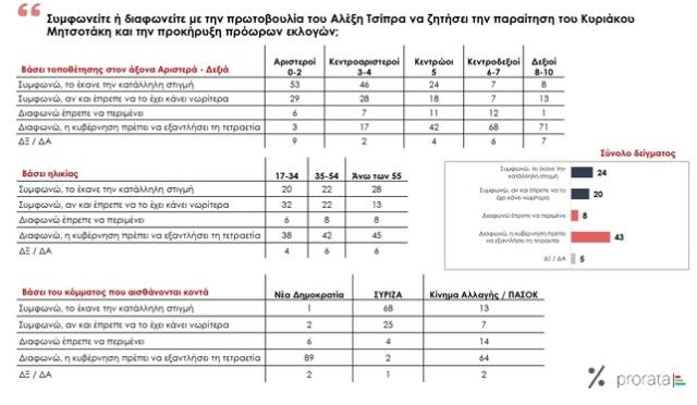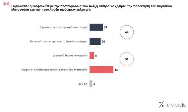 Συγκεκριμένα στο σύνολο των συμμετεχόντων στη δημοσκόπηση, το 44% εκφράζεται θετικά για το αίτημα του προέδρου του ΣΥΡΙΖΑ: «Συμφωνώ το έκανε την κατάλληλη στιγμή», δηλώνει το 24%, ενώ ένα 20% απαντάει πως «συμφωνεί αν και έπρεπε να το έχει κάνει νωρίτερα». Αντίθετα ένα 51% επί του συνόλου διαφωνεί με την πρωτοβουλία του Αλέξη Τσίπρα δηλώνοντας κατά 8% πως «θα έπρεπε να περιμένει» και κατά 43% πως διαφωνεί ριζικά καθώς «η κυβέρνηση θα πρέπει να εξαντλήσει την τετραετία».