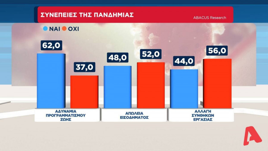Αναφορικά με τις συνέπειες της πανδημίας το 62% δήλωσε αδυναμία προγραμματισμού της ζωής του λόγω του κορονοϊού, ένα 48% επιβεβαίωσε πως είχε απώλεια εισοδήματος ενώ για το 44% άλλαξαν οι συνθήκες εργασίες.