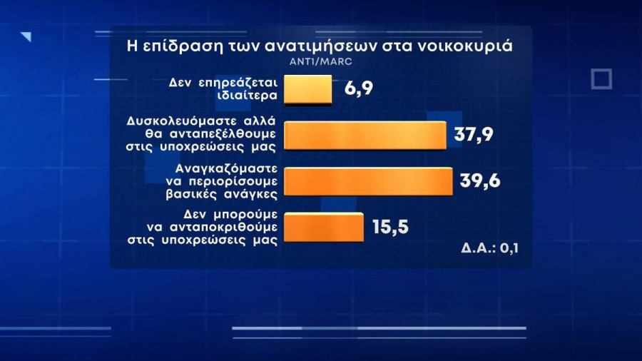 Προβληματισμένοι εμφανίζονται οι πολίτες για την ακρίβεια και τις ανατιμήσεις σε βασικά προϊόντα. Συγκεκριμένα το 39,6% λέει πως αναγκάζεται να περιορίσει βασικές ανάγκες, το 37,9% λέει πως δυσκολεύεται αλλά θα ανταπεξέλθει στις δυσκολίες, το 15,5% πως δεν μπορεί να ανταπεξέλθει ενώ ένα 6,9% πως δεν επηρεάζεται ιδιαίτερα.