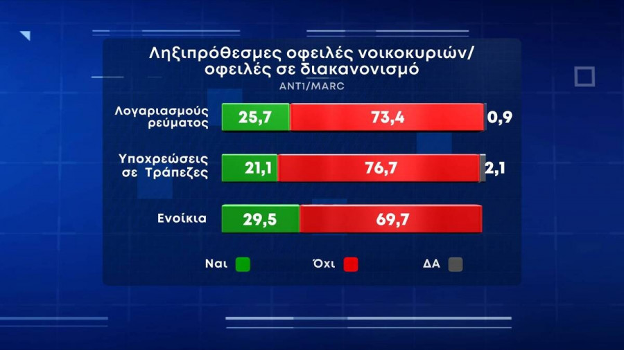 Σχετικά με τις ληξιπρόθεσμες οφειλές των νοικοκυριών ή τις οφειλές σε διακανονισμό έχει το 25,7% για λογαριασμούς ρεύματος, το 21,2% υποχρεώσεις σε τράπεζες και το 29,5% για ενοίκια.