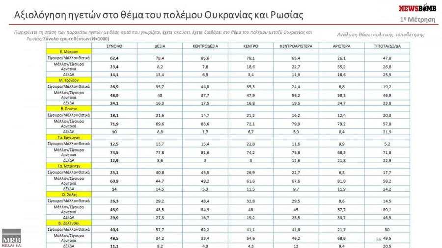 Συγκρίνοντας τις απαντήσεις των πολιτών για τους ηγέτες και κάνοντας την αντιστοιχία με την άποψή τους για τη χώρα τους, υπάρχει ταύτιση απόψεων. Είναι ενδεικτικό πως το 62,4% έχει θετική άποψη για τον Εμανουέλ Μακρόν, την ώρα που ένα 67,9% έχει θετική άποψη για τη Γαλλία. Το 40,4% έχει θετική άποψη για τον Βολοντιμίρ Ζελένσκι, ενώ το 51% έχει θετική γνώμη για την Ουκρανία. Αντίστοιχα χαμηλά είναι τα ποσοστά για τον Τζο Μπάιντεν με 25,1% θετικών απόψεων για εκείνον, όπως και για τις ΗΠΑ με μόλις 28,9% των πολιτών να έχει θετική γνώμη.