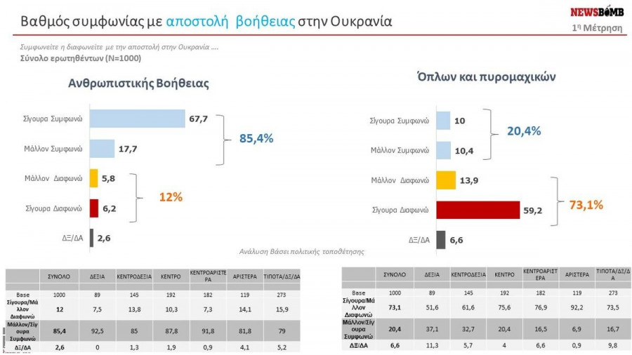 Ξεκάθαρες ήταν οι απαντήσεις των πολιτών και στα ερωτήματα που αφορούν την αποστολή βοήθειας στην Ουκρανία. Συνολικά το 85,4% συμφωνεί με την αποστολή ανθρωπιστικής βοήθειας, την ώρα που το 73,1% διαφωνεί με την αποστολή όπλων και πυρομαχικών. Αναφορικά με τον πολιτικό χώρο που τοποθετούνται οι ερωτηθέντες, όσοι ανήκουν στον χώρο της δεξιάς και της κεντροδεξιάς σε ποσοστά 92,5% και 85% συμφωνούν με την αποστολή ανθρωπιστικής βοήθειας, ενώ αντίστοιχα είναι τα ποσοστά για το κέντρο (87,8%), την κεντροαριστερά (91,8%) και την αριστερά (81,8%). Το 92,2% όσων δήλωσαν ότι ανήκουν στην αριστερά διαφωνεί με την αποστολή όπλων και πυρομαχικών, ενώ αντίστοιχα διαφωνεί το 76,9% όσων τοποθετούνται στην κεντροαριστερά, 75,6% όσων ανήκουν πολιτικά στο κέντρο, 61,6% για όσους τοποθετούνται στην κεντροδεξιά και 51,6% για όσους αυτοπροσδιορίστηκαν ως δεξιοί.