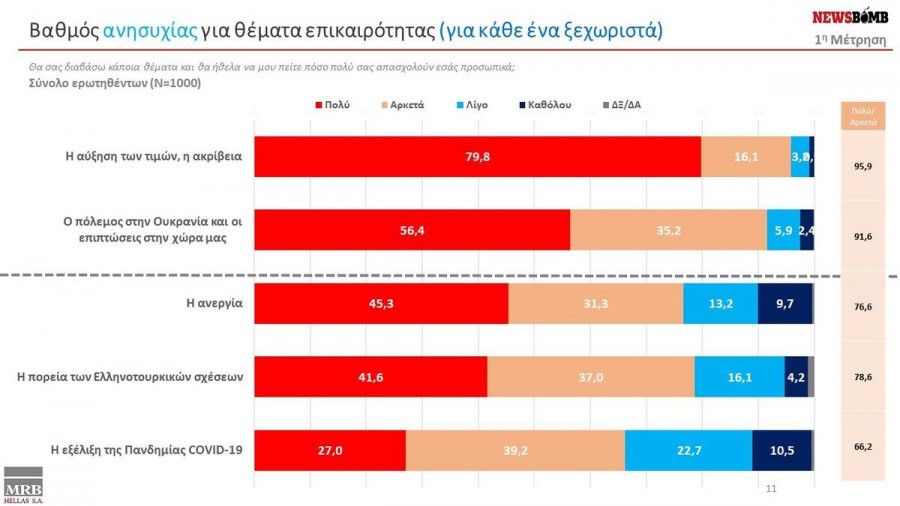 Όπως μπορείτε να δείτε και από τα στοιχεία της δημοσκόπησης στο ερώτημα «πόσο σας ανησυχούν τα θέματα που τρέχουν στην επικαιρότητα;», την πρώτη θέση καταλαμβάνει η αύξηση των τιμών και η ακρίβεια σε ποσοστό 95,9% (πολύ και αρκετά) και ακολουθούν: Ο πόλεμος στην Ουκρανία και οι επιπτώσεις στην χώρα μας σε ποσοστό 91,6% (πολύ και αρκετά), η ανεργία σε ποσοστό 76,6%. Στον ίδιο πίνακα φαίνεται να υποχωρεί ελάχιστα ο φόβος για την πορεία των ελληνοτουρκικών που όμως παραμένει υψηλός στο 78,6% και στην τελευταία θέση υποχωρεί η πανδημία με ποσοστό 66,2%. Στον πίνακα που ακολουθεί φαίνονται αναλυτικά οι απαντήσεις που έδωσαν οι ερωτηθέντες για κάθε ένα από τα θέματα της επικαιρότητας ξεχωριστά.