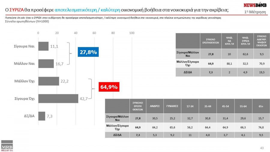 Ιδιαιτέρως σημαντικό εύρημα της δημοσκόπησης της MRB για το Newsbomb.gr είναι ότι ο ΣΥΡΙΖΑ δεν φαίνεται να κεφαλαιοποιεί την δυσαρέσκεια της κοινής γνώμης και δεν φαίνεται να αποτελεί τη λύση που περιμένει το εκλογικό σώμα. Στο ερώτημα αν ο ΣΥΡΙΖΑ θα μπορούσε να διαχειριστεί αποτελεσματικότερα τα ζητήματα της οικονομίας και αν προσέφερε καλύτερη βοήθεια στα τα νοικοκυριά, σίγουρα όχι και μάλλον όχι απαντά το 64,9%. Μόνο το 27,8% πιστεύουν ότι ο ΣΥΡΙΖΑ θα μπορούσε να προσφέρει βοήθεια στα νοικοκυριά. Όσοι ψήφισαν ΣΥΡΙΖΑ το 2019 σε ποσοστό 62,6% λένε ότι ο ΣΥΡΙΖΑ θα είχε διαχειριστεί καλύτερα τα πράγματα, ενώ το 32,5% των ψηφοφόρων της Κουμουνδούρου λένε το αντίθετο.
