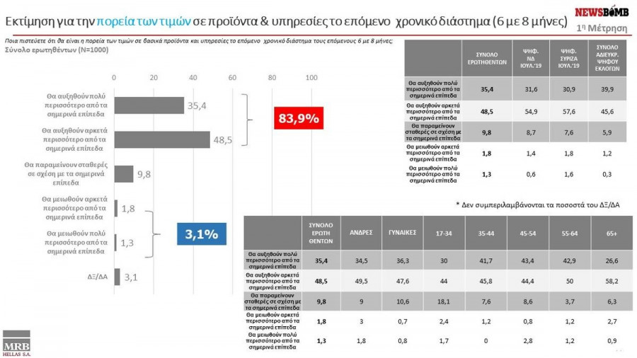 Το χειρότερο όλων είναι ότι οι πολίτες εμφανίζονται απαισιόδοξοι για το μέλλον της οικονομίας και των πληθωριστικών τάσεων. Το 83,9% πιστεύουν ότι οι τιμές τους επόμενους 6 με 8 μήνες θα αυξηθούν αρκετά ή πολύ περισσότερο από ότι είναι σήμερα. Μόνο το 3,1% πιστεύει ότι θα υπάρχει αποκλιμάκωση. 86,5% όσων ψήφισαν ΝΔ το 2019 θεωρούν ότι οι τιμές θα αυξηθούν περισσότερο. Περίπου ίδιο ποσοστό με τους ψηφοφόρους του ΣΥΡΙΖΑ που το 87,5% πιστεύει ότι οι τιμές θα αυξηθούν αρκετά ή πολύ περισσότερο από ότι σήμερα.