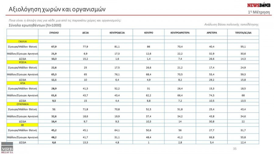 Για τη Γαλλία το 67,9% των πολιτών να έχει σίγουρα ή μάλλον θετική άποψη ενώ για την Ουκρανία το 51% των πολιτών να έχει σίγουρα ή μάλλον θετική άποψη. Από εκεί και πέρα, αρνητική άποψη υπάρχει σε ποσοστό 48,2% για την Ευρωπαϊκή Ένωση και σε ποσοστό 46,5% για τον ΟΗΕ.