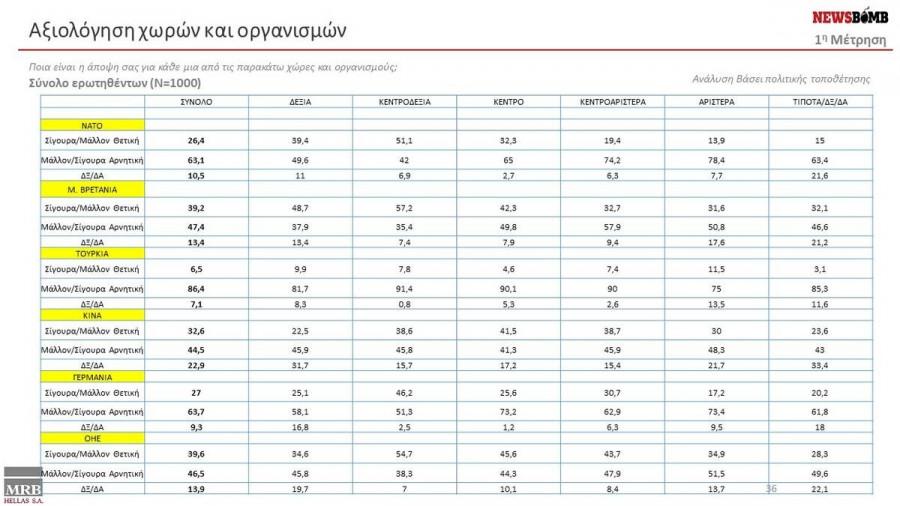 Αντίθετα, για το ΝΑΤΟ μόλις το 39,4% των πολιτών που ανήκουν στη δεξιά έχει θετική άποψη, ενώ ένα 51,1% των πολιτών που προσδιορίζονται ως κεντροδεξιοί έχει θετική άποψη για τη συμμαχία. Οι πολίτες που ανήκουν στο κέντρο έχουν αρνητική γνώμη σε ποσοστό 65%, ενώ αυτό ανεβαίνει στο 74,2% για τους πολίτες που ανήκουν στην κεντροαριστερά και φτάνει στο 78,4% για όσους αυτοπροσδιορίστηκαν ως αριστεροί στην έρευνα.
