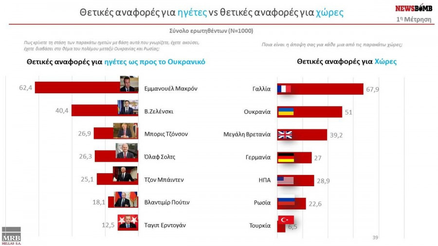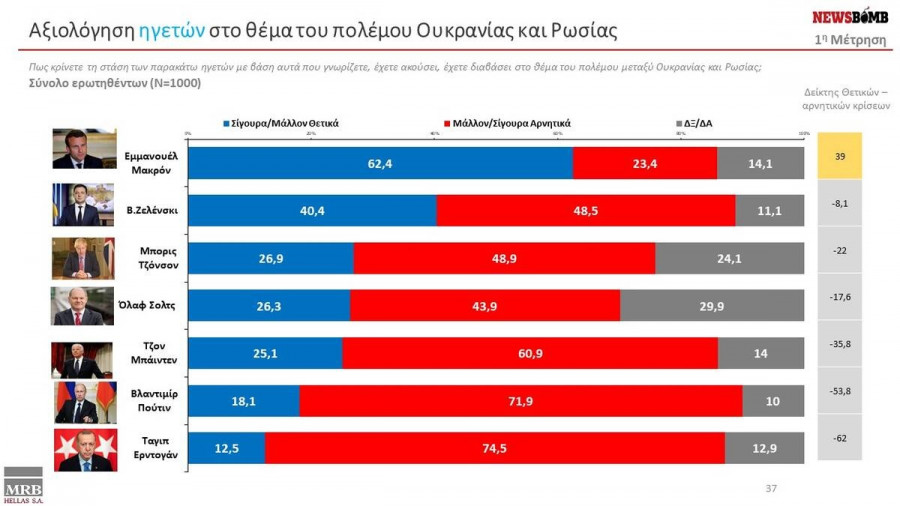 Ο Γάλλος πρόεδρος Εμανουέλ Μακρόν, είναι ο μοναδικός που συγκεντρώνει θετικό ποσοστό στο δείκτη θετικών - αρνητικών κρίσεων. Συγκεκριμένα, το 62,4% των ερωτηθέντων έχει σίγουρα ή μάλλον θετική άποψη για τον πρόεδρο της Γαλλίας και τη στάση του στο θέμα του πολέμου.
