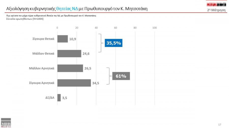 Σε ό,τι αφορά στην αξιολόγηση της κυβερνητικής θητείας με πρωθυπουργό τον Κυριάκο Μητσοτάκη, το 61% την κρίνει αρνητικά/μάλλον αρνητικά και θετικά/μάλλον θετικά το 35,5%.