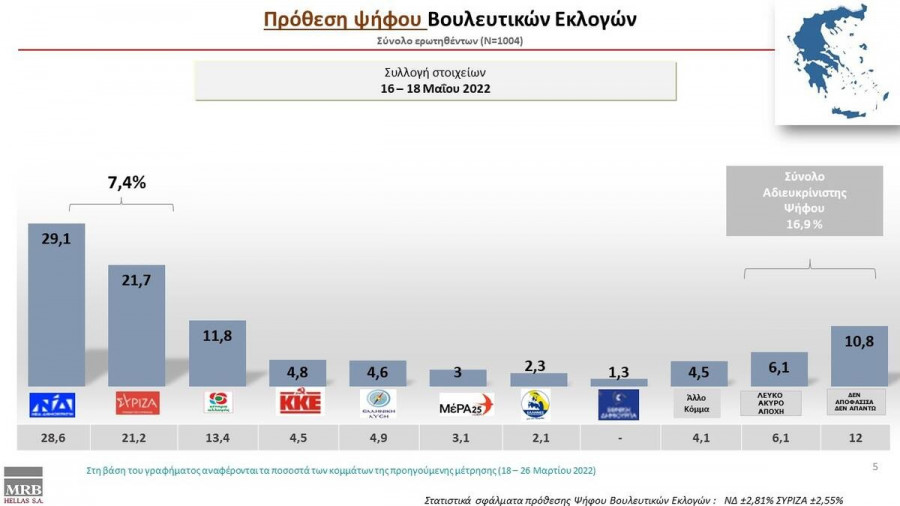Ακολουθούν ΚΚΕ με 4,8%, Ελληνική Λύση με 4,6% και ΜέΡΑ25 με 3%. Η αδιευκρίνιστη ψήφος ανέρχεται στο 16,9%. Η σύγκριση με την προηγούμενη μέτρηση του Μαρτίου δείχνει αύξηση του ποσοστού της ΝΔ κατά 0,5%, ενώ ο ΣΥΡΙΖΑ χάνει μισή μονάδα και το ΚΙΝΑΛ σημειώνει απώλειες 1,6%.