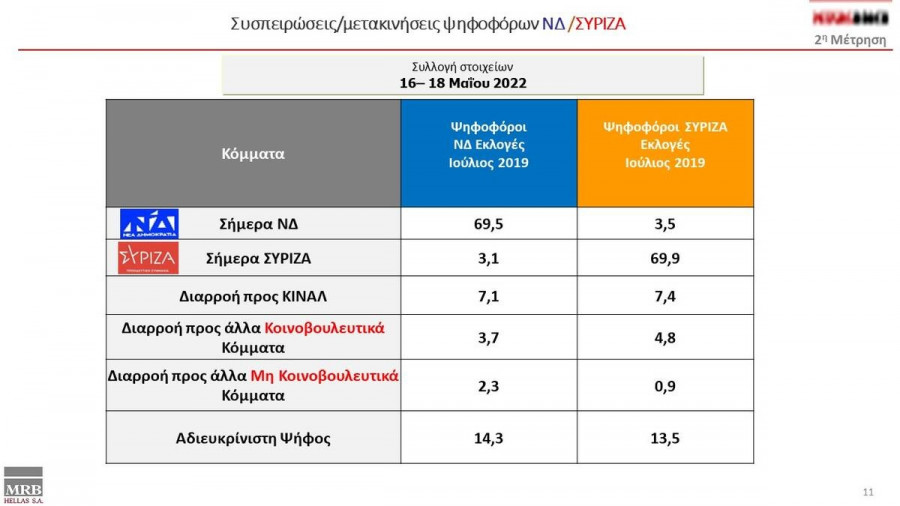 Αντίστοιχη είναι η εικόνα και στο ΣΥΡΙΖΑ με τη συσπείρωση να φτάνει στο 69,9%. Ενδιαφέρον παρουσιάζει ότι οι διαρροές τόσο της ΝΔ όσο και του ΣΥΡΙΖΑ προς το ΚΙΝΑΛ δείχνουν να περιορίζονται σημαντικά.